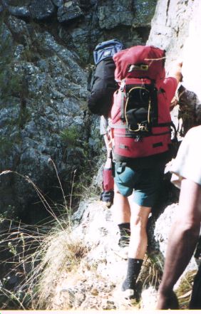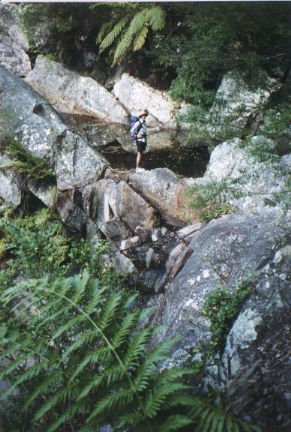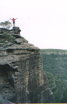 Alan Davey on the cliffs opposite Rock Slabs Creek (21KB). Photo by Eric Pickering.