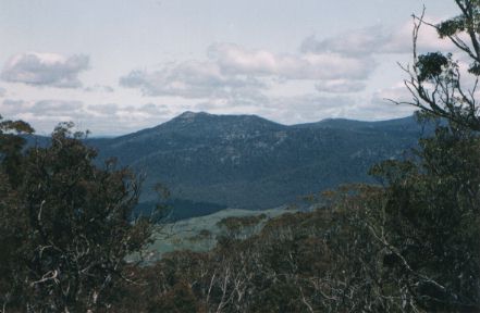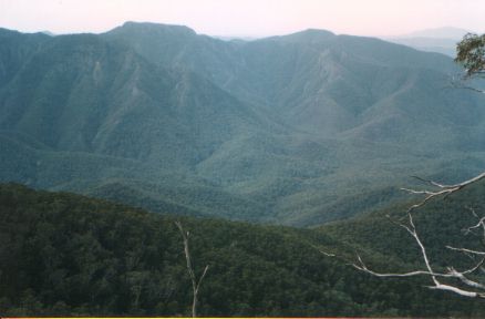 The Woila seen from Big Badja (18KB). The major peaks are Mother Woila, Tabletop, and Scout Hat.