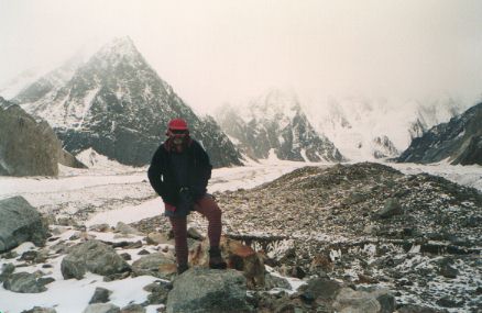 K2 Base Camp (and me) seen from Broad Peak Base Camp on the Godwin Austen Glacier (29KB). The Gilkey Memorial is at the base of K2, about centre photo.